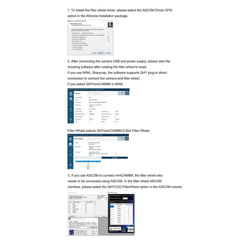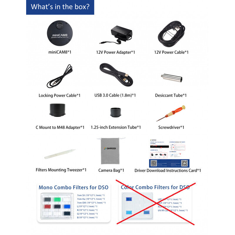 QHY miniCam8 Mono Combo kamera yra kompaktiška ir galingi dėžė gilaus dangaus (Deep-Sky) stebėjimui, taip pat Mėnulio ir planetų stebėjimui. Ji pagrįsta 8 MP Sony IMX585 back-illuminated CMOS matmenų sensoriais su dviejų lygių termoelektriniu atvėdinimu, įtraukia 8 padėčių filtrų rotorų LRGB ir siaurųjų juostų nuotraukoms, su specialiai pritaikytomis filtrų ir optimaliais astronomijos pasiekimais.