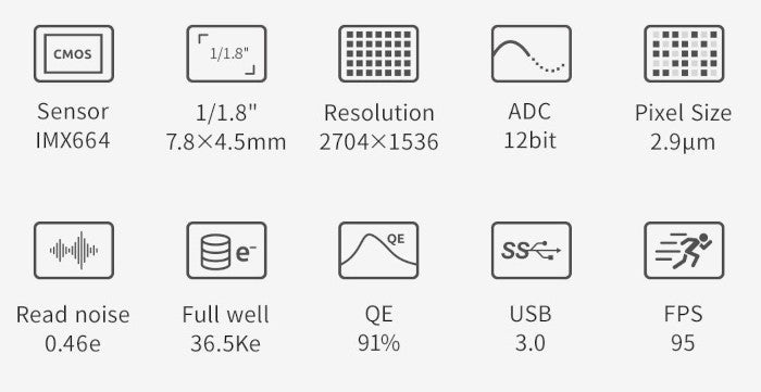 - Compatible avec les logiciels ASIStudio, Prism, NINA, FireCapture, MaximDL, SharpCap, PHD2, AllSkEye, etc.
