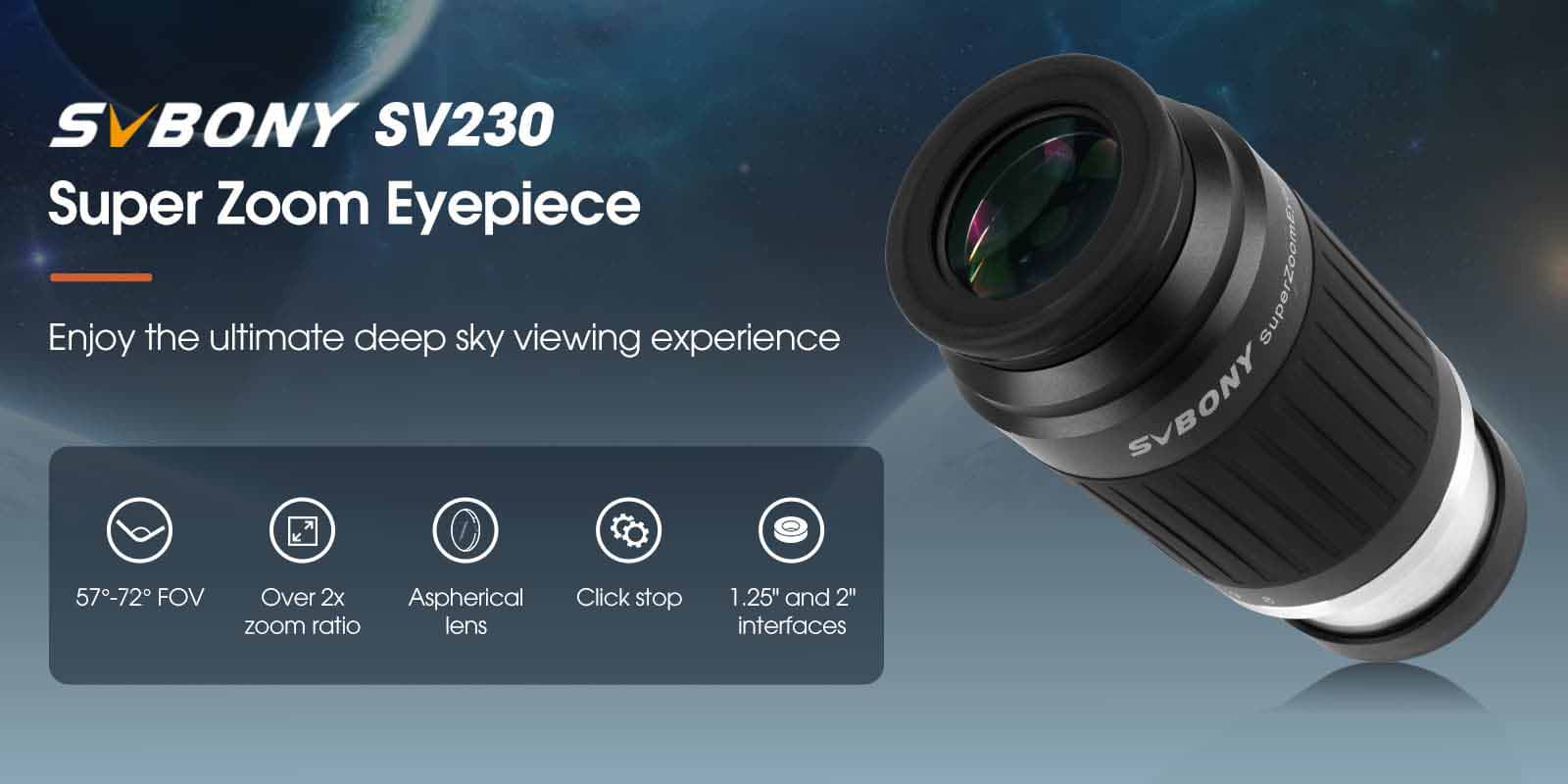 Optimisez vos séances d'observation avec l'oculaire SV230 de SVBONY, un oculaire asphérique à zoom super offrant un champ de vision panoramique de 57° à 72°. Son design parfocal permet des changements d'oculaire sans perte de réglage de mise au point, simplifiant ainsi votre expérience d'observation.